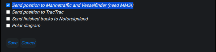 Everytime your Sailserver is logging information, your position will be sent to Marinetraffic and Vesselfinder. If you also use Noforeignland, then you place a checkmark here as well, and when you complete a track, it will also be updated on Noforeignland.